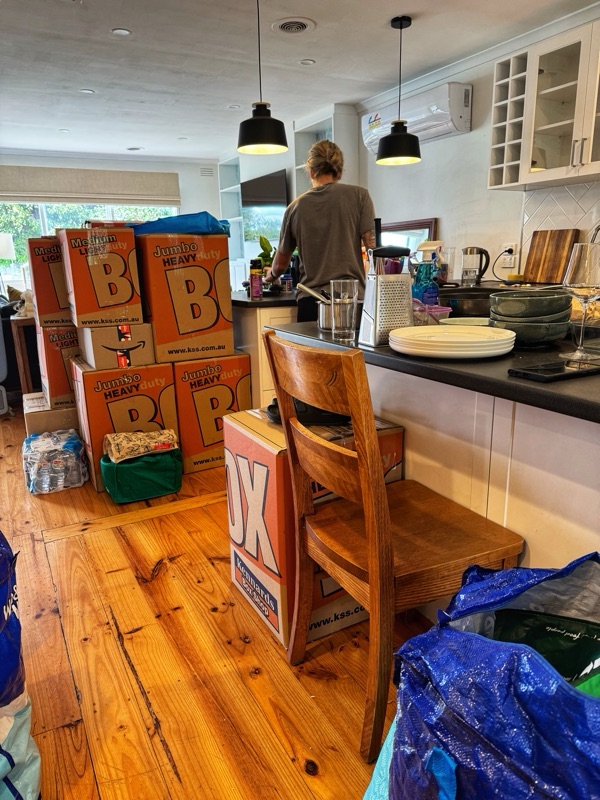 we are in the new house and the kitchen is unpacked. Though we had fish and chips for dinner! Tomorrow I go shopping for a hose, a spade and a pair of secateurs. Not going anywhere!