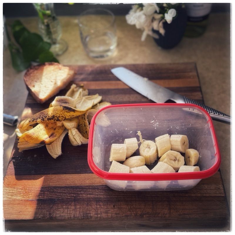 Left over bananas, going over ripe on the bench, are great for smoothies. Peel, chop and freeze- flow freeze them if you can – they are great for smoothies and banana cake and instant ice cream (more on that on Wednesday and a flour free chocolate cake too!