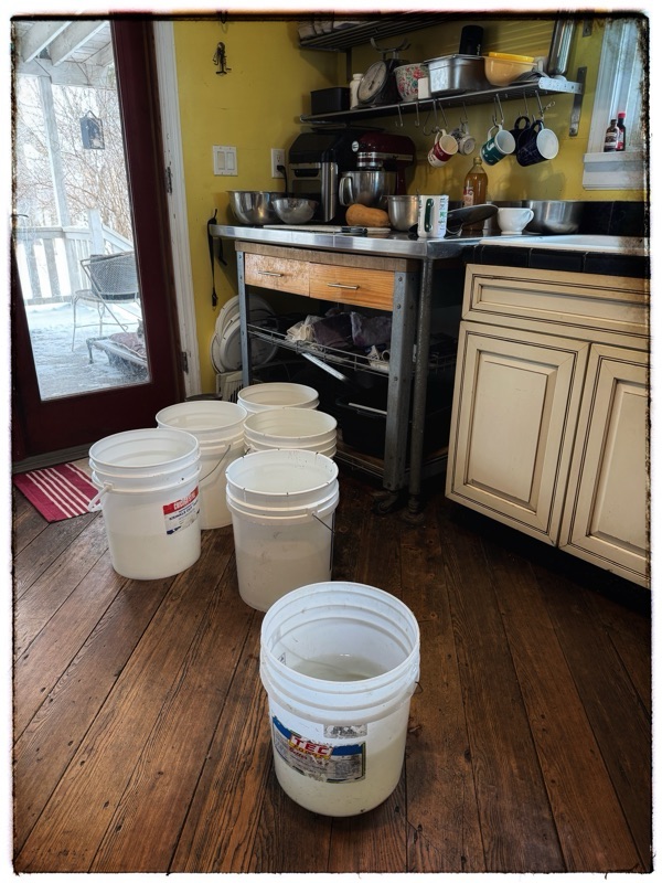 This is what the kitchen floor looks like with all the buckets of water ready to go out and with the temperatures going even further down, (though there is one odd day above freezing later in the week) we are carrying water out for the animals in buckets for the foreseeable future. The outside faucet is frozen solid.