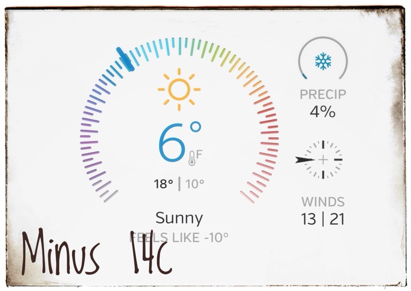 In a few days we are down as low as 0F which is minus 17 in celcius. This morning we are at 6F and blowing.