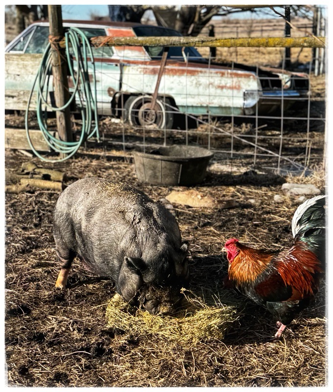 5. Nice to see the change in the weather and daylight! Im finally noticing it here in the far north. 🙂 That would be scary to see a pig choking; I’m glad he’s OK. Eggs are at a premium these days. My grocery store has empty shelves of them. 😦