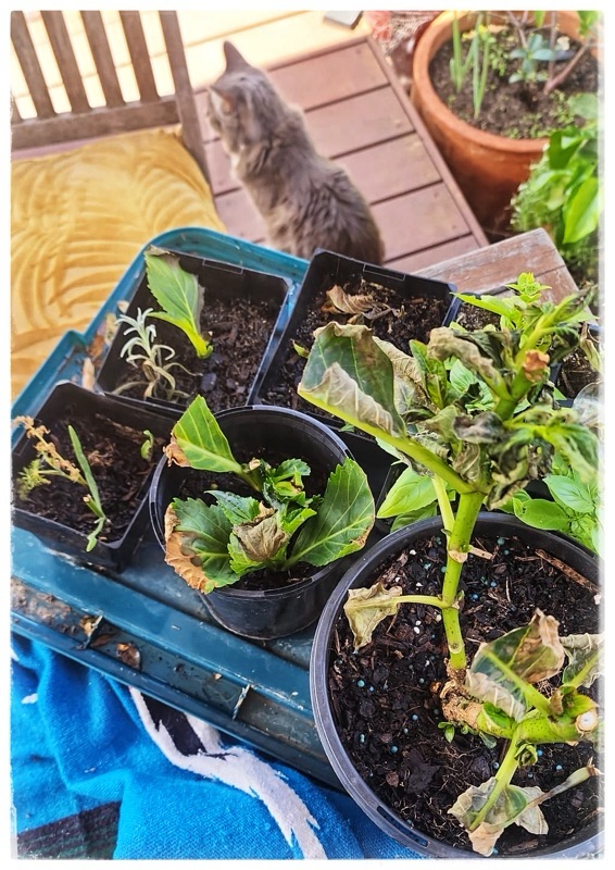 We had a bit of an incident with the garden cuttings in Melbourne. It went up to 42C (107F) – and the cuttings had been left out in the sun. (There had been rain the night before and well – you know the rest – we have all done it). But it is not too bad! The smallest and weakest are toast but I think it will only make the others stronger. Or struggle. Who knows. But I think they will be fine.