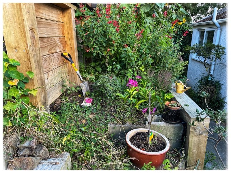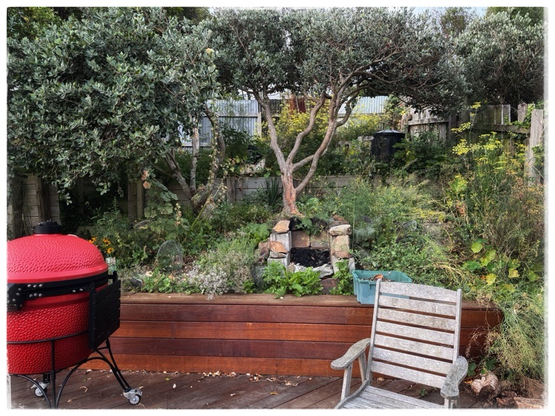 The city garden is on the steep side of a small valley, like a chip out of a big hill. There is a rugged micro climate up here, the Southerlies are mitigated by the hill but it is still a bit windy when a Nor’West blows in.