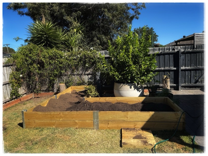 The straight unkind lines of the raised bed will be softened as I go too. With plantings of hardy herbs outside the beds.