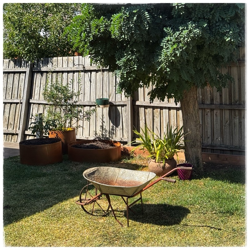 The soil dumped in the driveway is one quarter mushroom compost. Daughter has a routine appointment with her midwife team this morning so I have to stay clean until we get back. But I think I am roughly half way shifting the soil with this antique wheelbarrow lent by the lady across the road. I will do more this afternoon and hopefully finish Wednesday before the rain. At least I hope there will be rain.