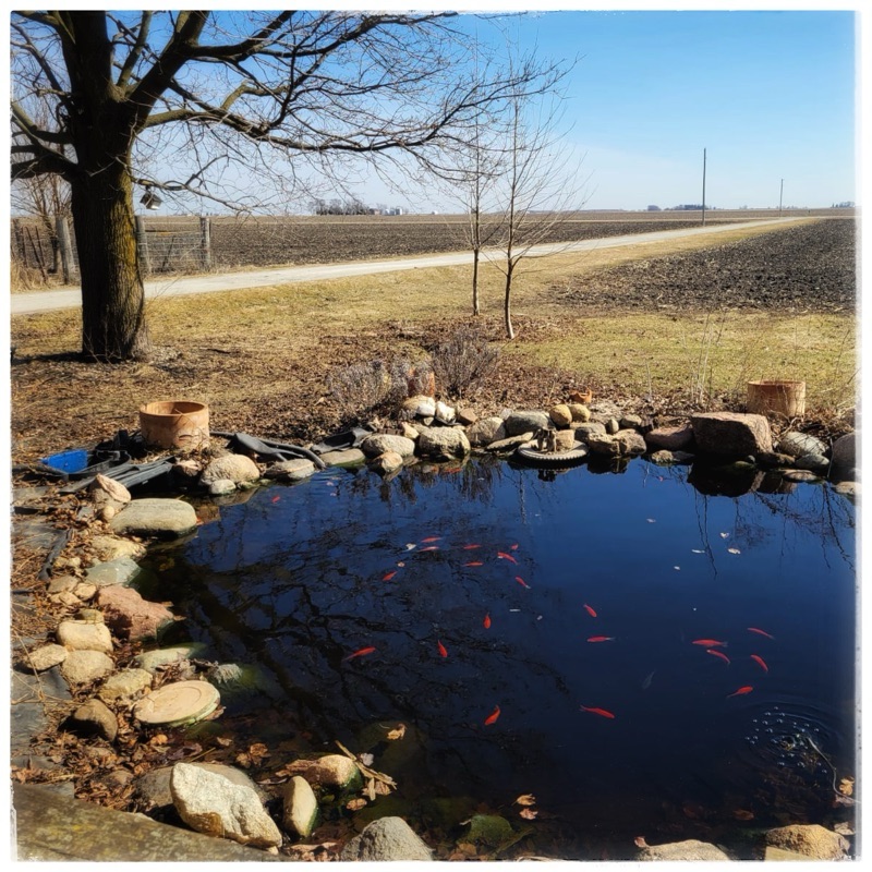 Blue sky and budding trees on the farm, that is lovely to see. I have always wondered- do the farm cats ever try to go after the pond fish, or do they even see them? I think Tim Tam very much likes having you around for company while daughter is at work. There is a man, Earl, on my regular walking route that leaves out a water bowl for the dogs. Very sweet man, and I think he misses his dog very much. That was how I met him originally but now he just walks alone often going to the big construction sites on the west side of town to chat with the workers.