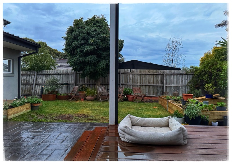 It is raining out in my little boney city garden. Light rain-drizzle. I am calling it boney (the garden) because I am creating this garden as art from the bones outwards. And it is still bones.